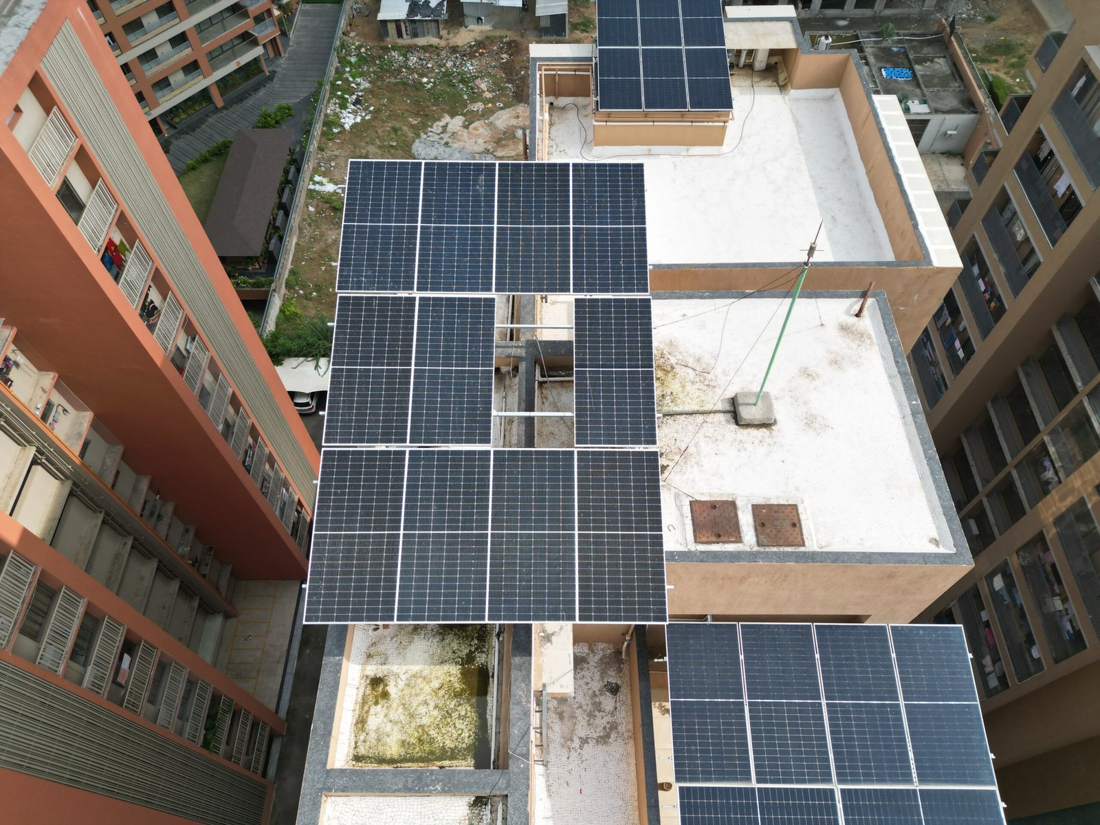 The 72 kW solar plant generates approximately 100,000–105,000 units of clean electricity annually, supplying power to common-area infrastructure such as lighting, elevators, water pumps, security systems, and management offices.